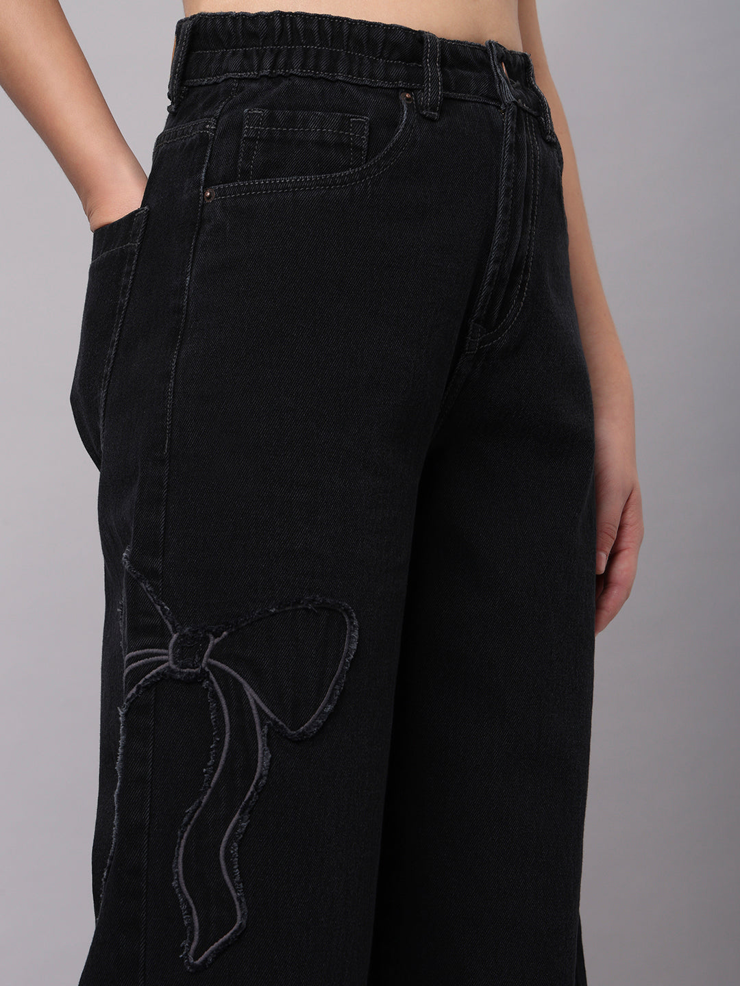 Elevate your casual denim game with these statement-making wide-leg jeans. Featuring a trendy high-waist fit and a relaxed, full-length silhouette, they offer both comfort and vintage-inspired style. The unique light-blue stitched bow appliqué on the upper leg adds a charming, playful touch, making these jeans perfect for adding a whimsical flair to your everyday look. Pair them with a cropped tee or a fitted tank for a balanced, fashion-forward outfit.